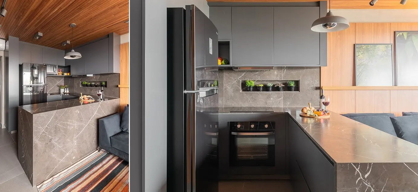 O projeto é do arquiteto Pietro Terlizzi que integrou cozinha com a sala de TV e o living. Para delimitar esse espaço entre os ambientes, uma bancada em mármore foi instalada e cumpre o papel com muito charme. Destaque para os armários com portas largas na cozinha e gavetões com puxadores embutidos. Aqui, a marcenaria planejada é uma grande aliada.