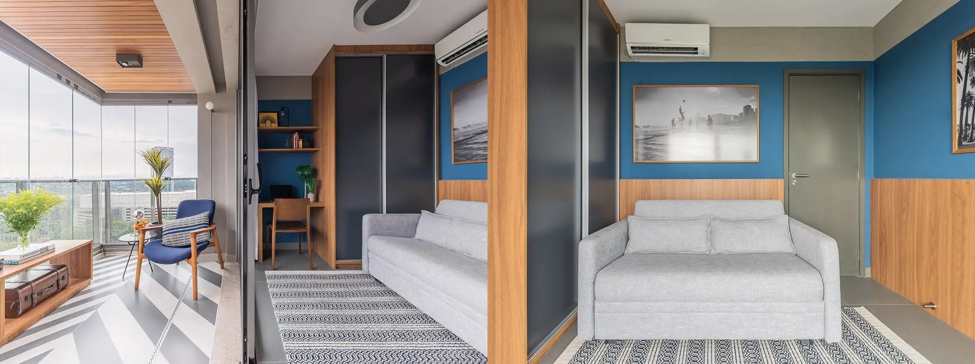 Integrar os espaços é uma das soluções para otimizar cada metro quadrado de um apê pequeno. Para além disso, é importante que os espaços também sejam multifuncionais, como nessa inspiração em que o quarto de hóspedes também é home office e a varanda recebeu mesa para as refeições.