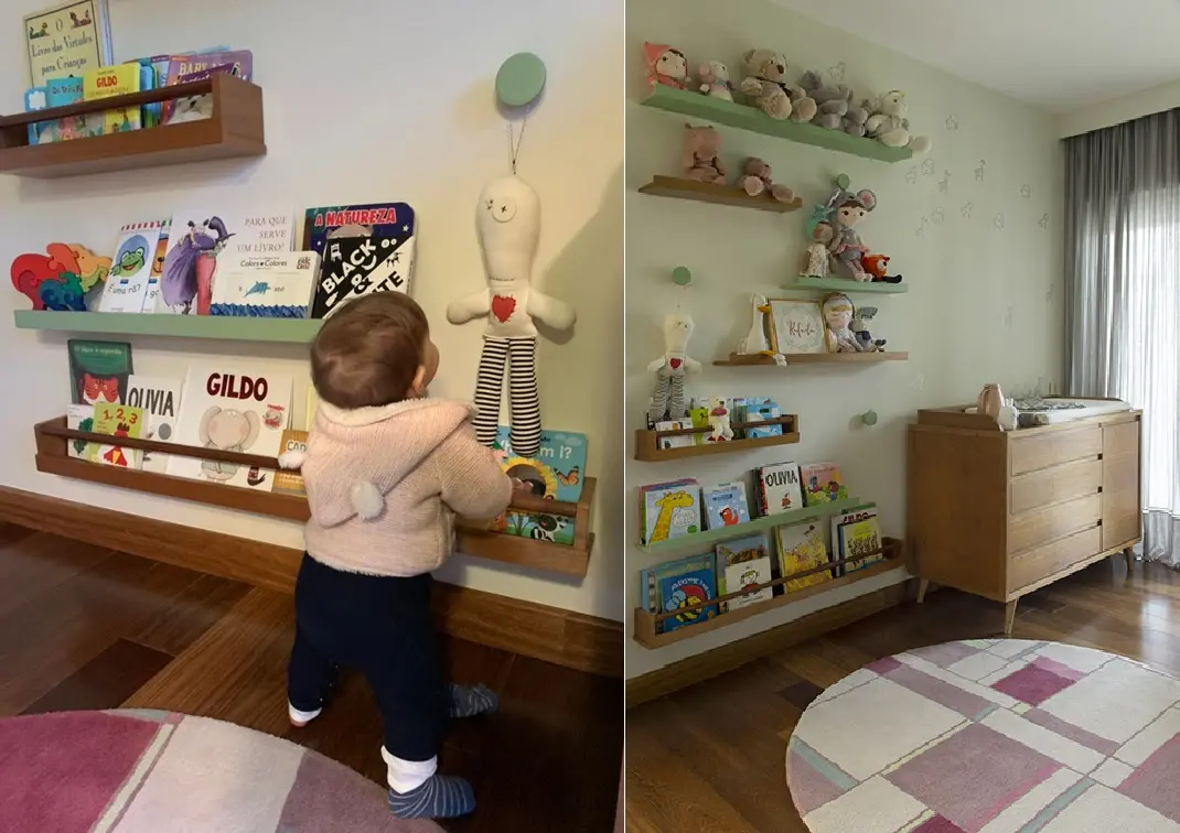 Essa praticidade também se dá com a organização vertical com prateleiras para livros, por exemplo, na altura das crianças. Usar as paredes é uma ótima estratégia para armazenar brinquedos e ao mesmo tempo manter o espaço de circulação livre.