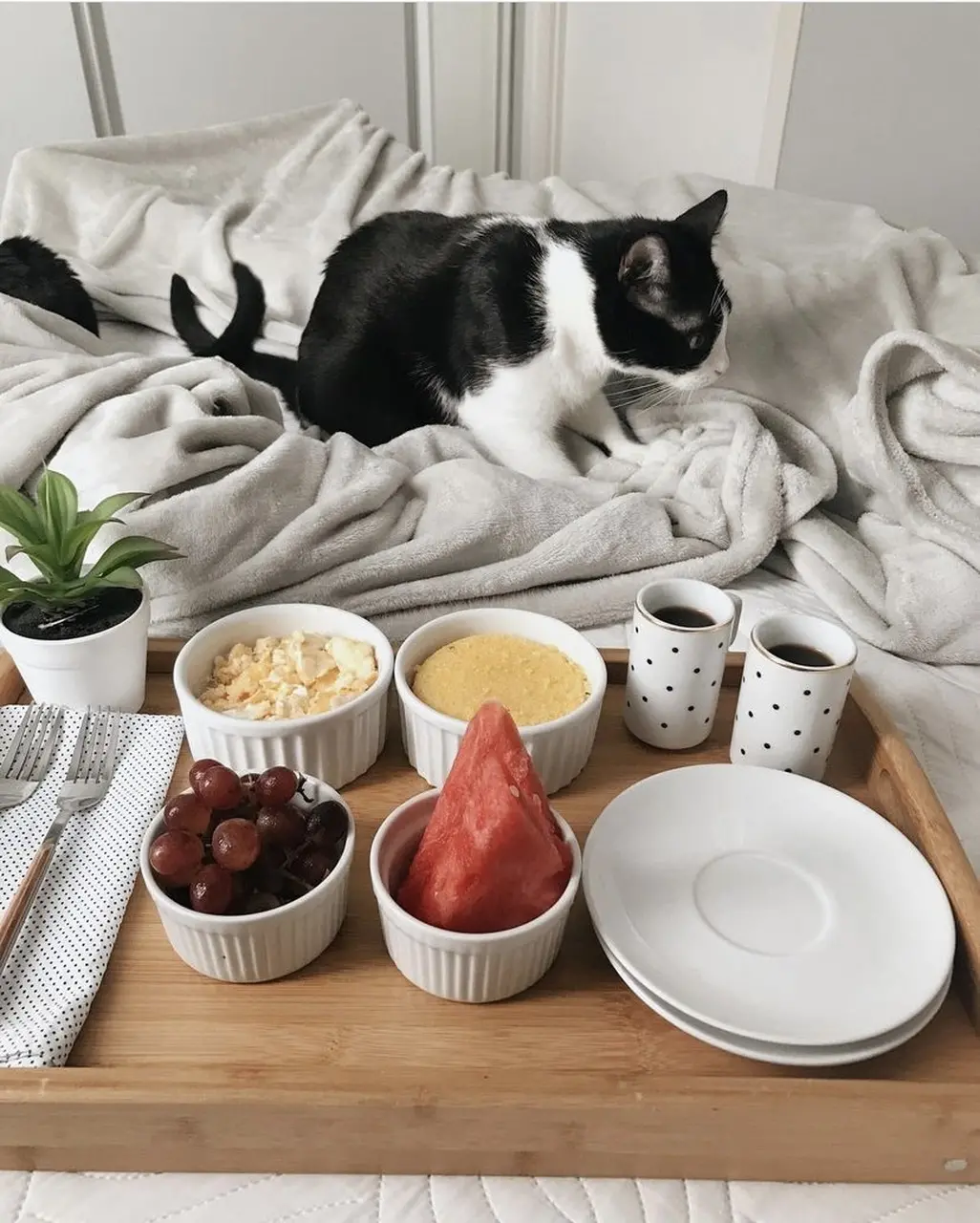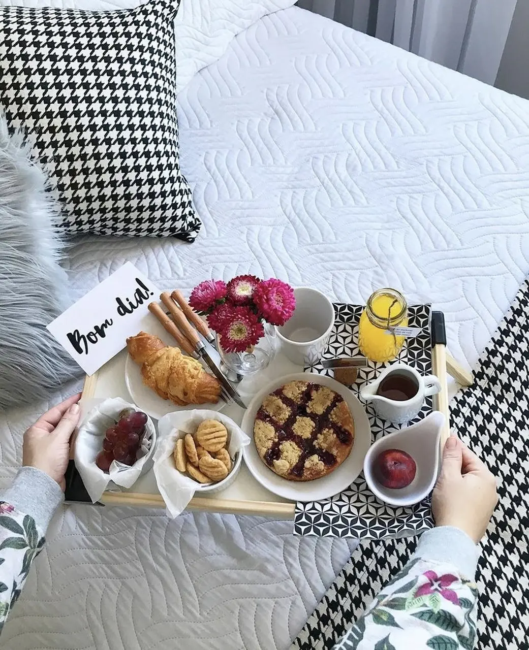 Lembre-se que o importante é que tudo fique confortável para manusear, pois a experiência do café na cama pede conforto e praticidade. Imagine aí a caixa de leite e o pote de manteiga em cima da bandeja: o risco de derramar nos lençóis e frustrar o momento é grande.