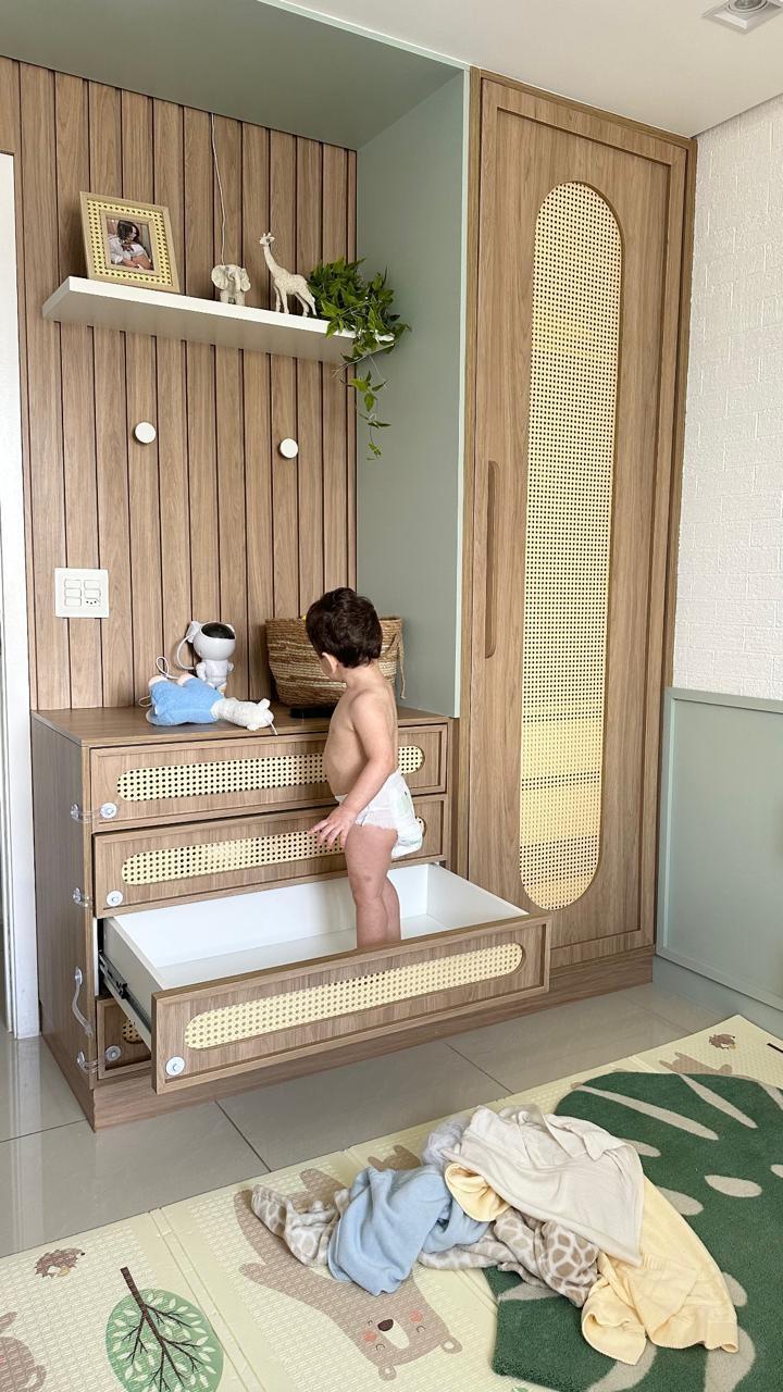 Em quarto de criança, os móveis planejados são a melhor opção por serem fixos na parede. A cômoda, por exemplo, têm alto risco de acidentes quando a criança começa a andar e, ao abrir todas as gavetas, pode virar em cima dela. Há opções de travas, mas são bem frágeis e não muito recomendadas. Por aqui, coloquei chave em cada gaveta para evitar acidentes.