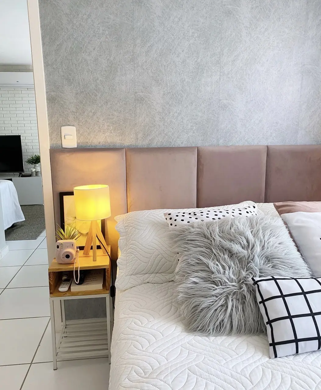 O mesmo pensamento segue ao decorar o quarto, conferindo personalidade ao ambiente com itens como cabeceira estofada e papel de parede. Só esses dois itens com uma boa colcha de cama já vão lhe dar a sensação de lar, pois abraça nos detalhes.