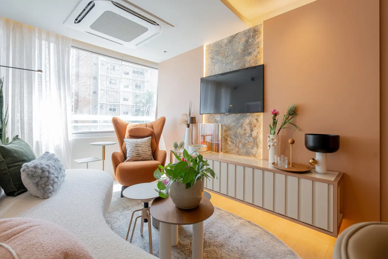Havia uma varanda ali próxima à janela, que foi integrada à sala para aumentar esse espaço de convívio. Um rack de TV estreito e suspenso também otimiza o espaço do ambiente, assim como a escolha do mobiliário curvilíneo, que dá movimento à decoração e deixa tudo mais interessante.