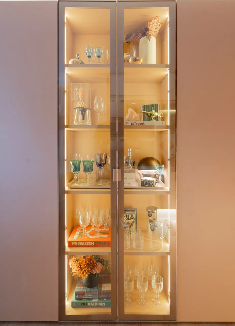 Ter a cozinha na área social foi um desafio superado com sucesso com estratégias como camuflar a geladeira com marcenaria. É uma cozinha completamente funcional com lava louças e gaveta para lixeira embutida, filtro, torre quente e tudo o que é necessário, mas com estratégias de design.