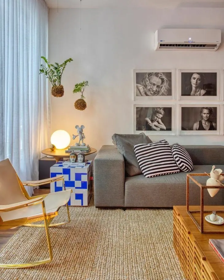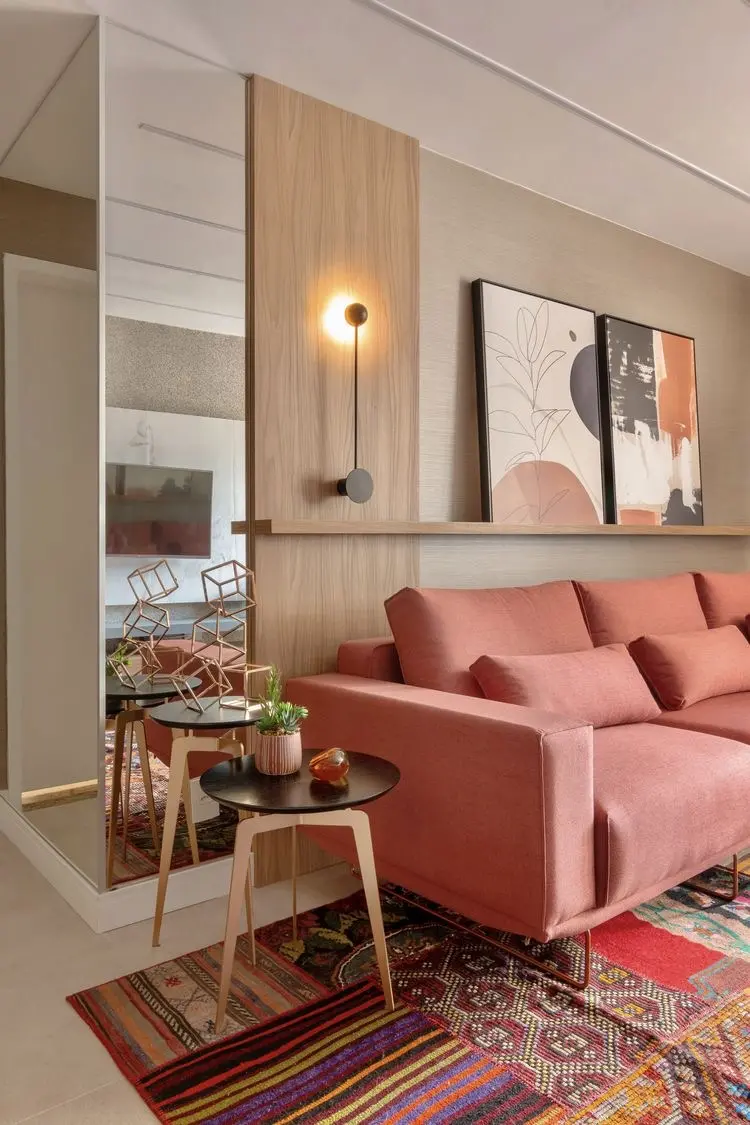 Além de proporcionar mais aconchego, o tapete protege o piso, delimita espaço e também é isolante térmico. A peça dá o toque de personalidade e é importante que tenha tons que combinem com o restante da sala e seja maior que o seu sofá em comprimento.