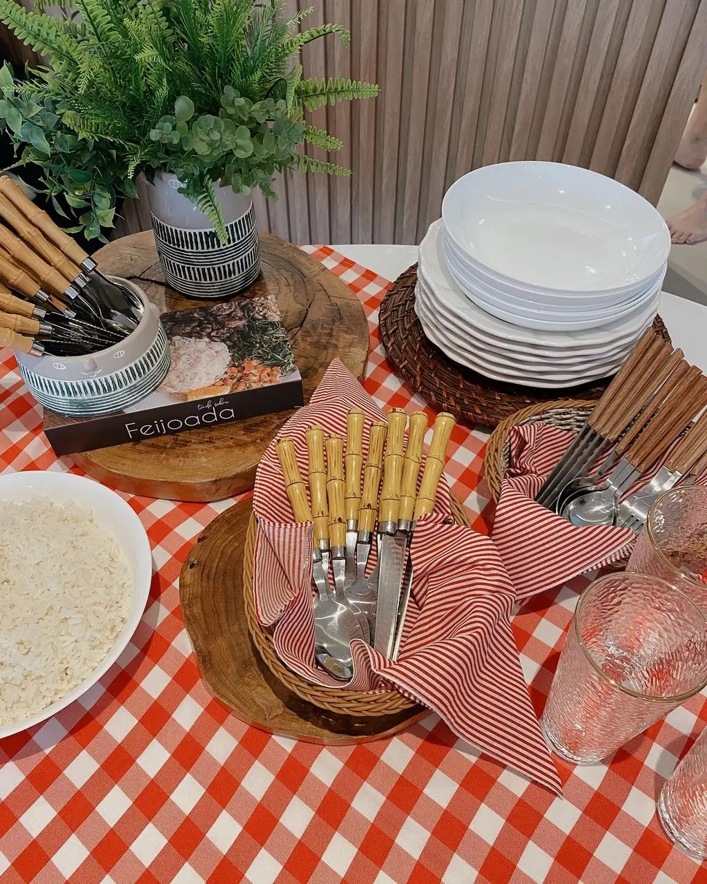 Agora, trouxe imagens do dia em que fiz uma feijoada para celebrar um aniversário em casa para familiares. Na prática, você percebe que misturei estilos de pratos e talheres nessa mesa e, ainda assim, ficou harmônico?