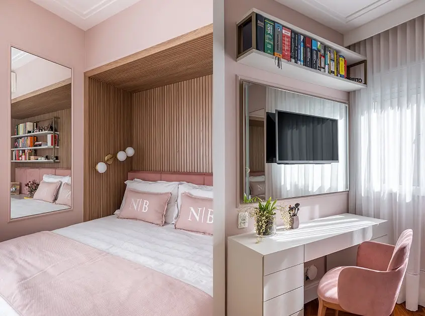 O tom de rosa pastel marca presença em muitos detalhes de forma tão discreta, que vou pontuar para que você observe: parede, cabeceira, almofadas, peseira e poltrona da penteadeira. A tonalidade escolhida é um convite para o descanso e não polui o ambiente.