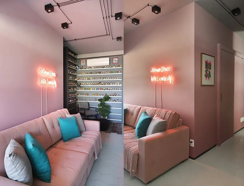 Tem painel em mdf, escada de vidro, puffs no tom verde e, claro, um sofazão rosa bebê, mostrando na prática que dá pra usar pitadas do tom com muito charme. E aí, gosta da ideia de ter pitadas de rosa na decoração da sua casa também? Inspire-se!