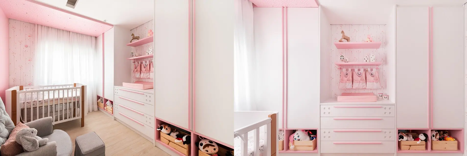 Caso o quarto seja de uma adolescente ou criança e a ideia seja criar um cenário Barbiecore, vale apostar em peças com design curvilíneo, acabamentos brilhantes, estampas florais e o estilo vintage, que imprime ares nostálgicos e românticos ao ambiente. O projeto do quarto de bebê da arquiteta Daniela Funari fez isso muito bem.