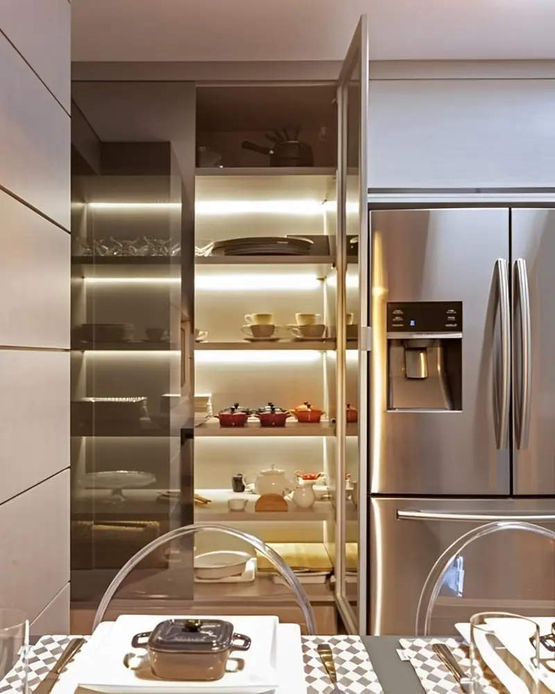 “O importante é que o espaço seja setorizado e funcional para organizar travessas, pratos, bandejas e tudo o que compõe o serviço de mesa. A chave está no planejamento inteligente, com o uso de prateleiras e divisórias verticais para acomodar peças como bandejas e travessas de pé, evitando empilhar demais e facilitando o acesso no dia a dia”, destaca a arquiteta.