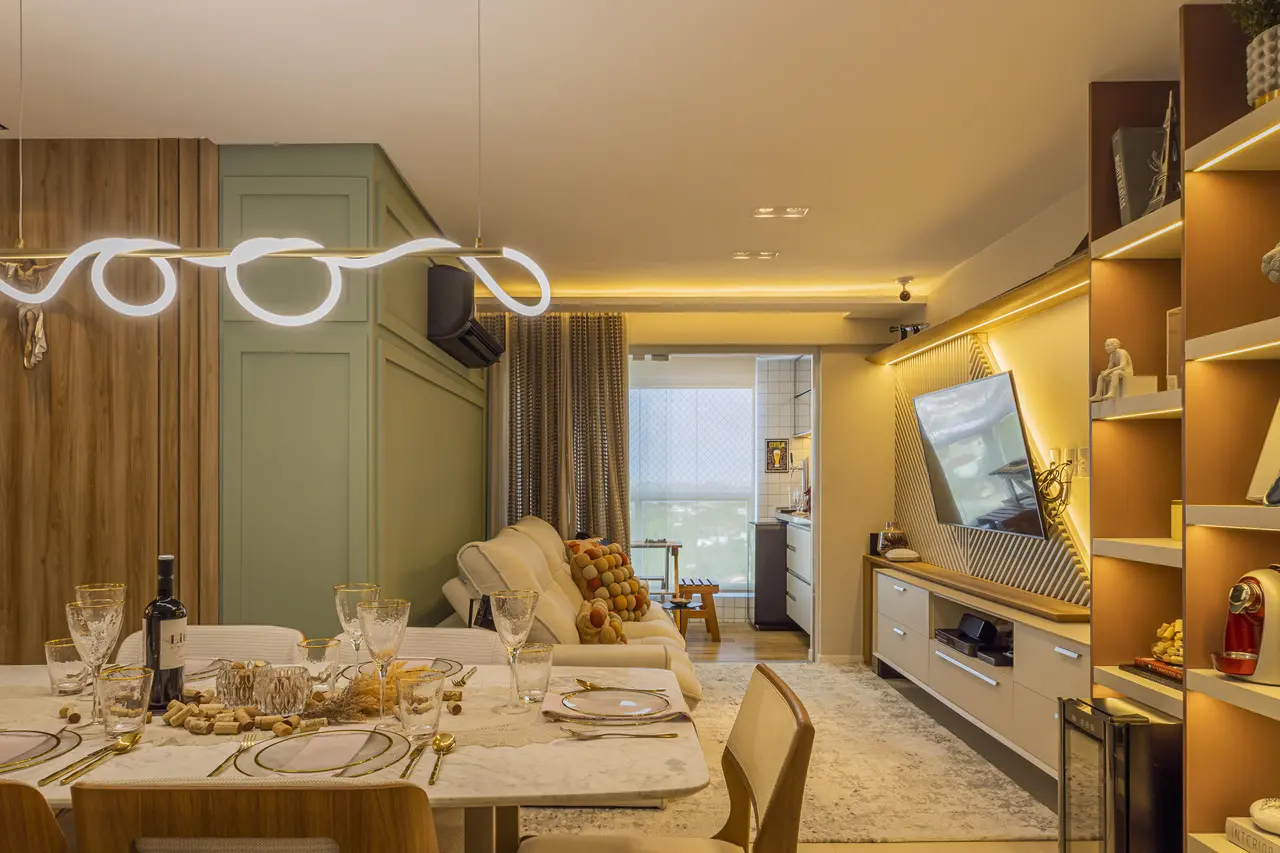 A luz mais amena, amarelada e quente proporciona mais acolhimento e cria uma atmosfera ideal para o descanso. Dependendo da escolha da luminária, é possível misturar a iluminação branco quente e branco neutro sem pesar no ambiente. Uma complementa a outra de acordo com a cena que você quiser criar em casa: leitura ou jantar romântico? É possível com essas escolhas.