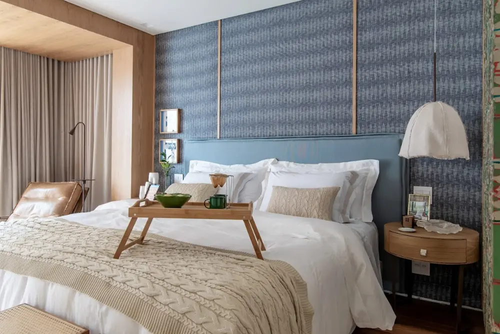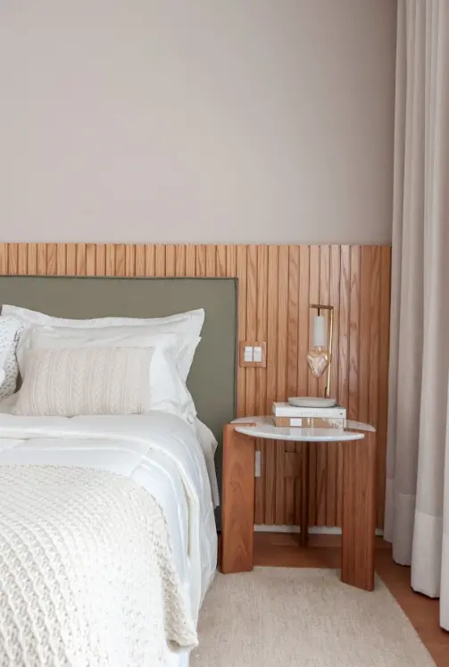 Para os mais minimalistas que desejam apenas um apoio para o controle da TV, basta escolher uma mesa que se encaixe confortavelmente entre a cama e a parede, por exemplo. Em ambos os casos, vale ficar atento à altura do móvel, que pode ser igual ou um pouco menor que o colchão.