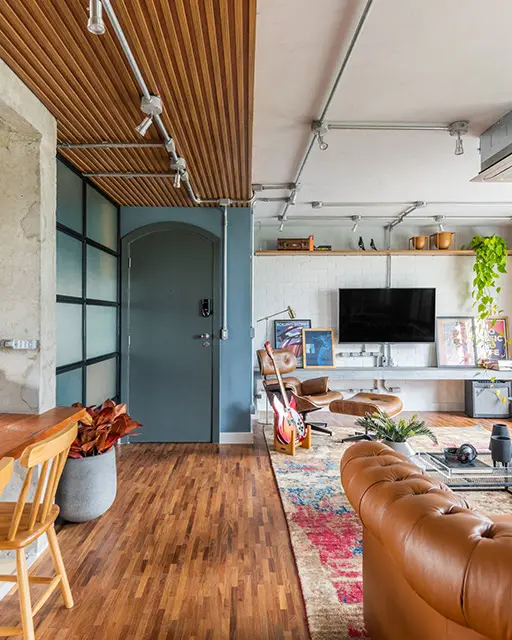 Caso não queira investir tanto, só em pintar de uma cor diferente ou colocar detalhes em ripas, também já dá um charme especial. Nesse ambiente, as ripas de freijó no forro criaram um corredor que dá as boas-vindas. Um detalhe que, com certeza, não passa despercebido.