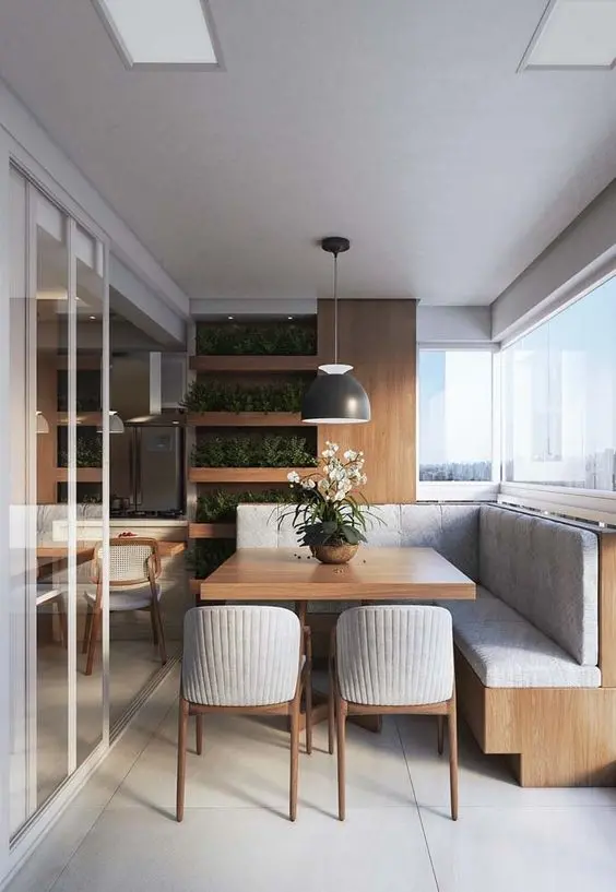 Ele pode vir acompanhado de uma mesa quadrada ou redonda e a escolha do modelo vai depender também do tamanho do ambiente. O sofá é comumente instalado no canto da varanda e a parte em marcenaria pode até ser um baú de armazenamento de objetos. Super funcional!