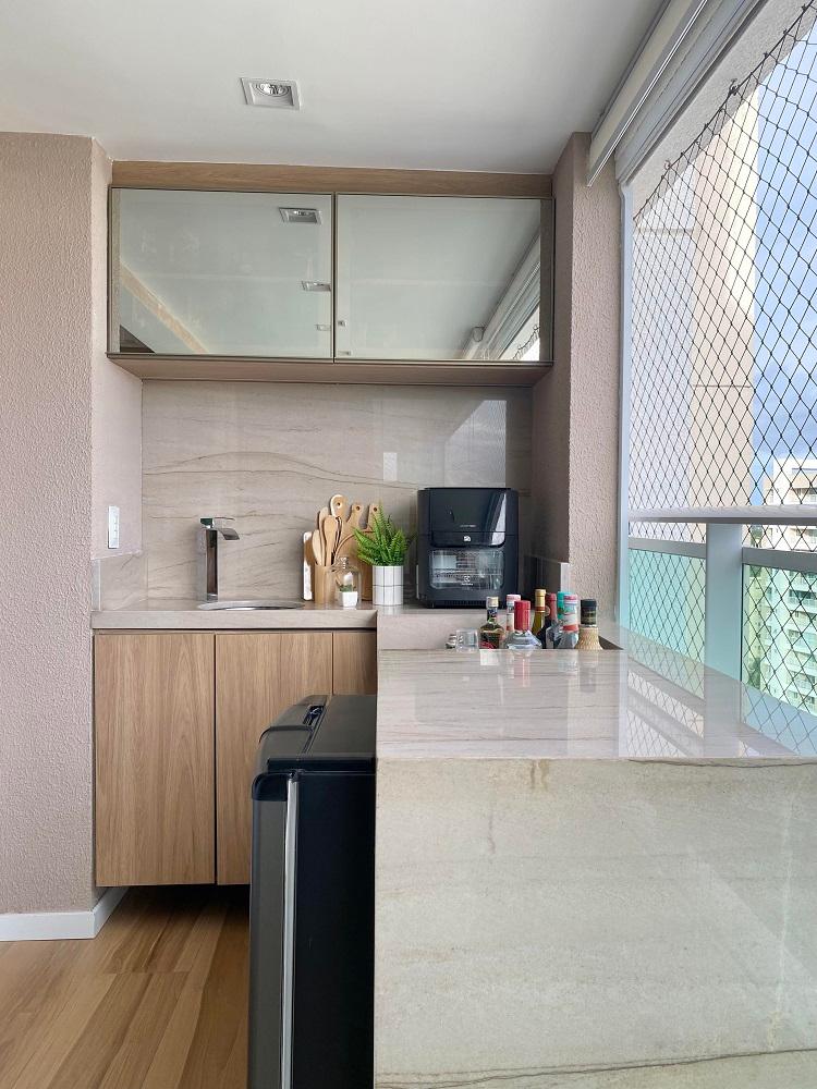 Esse novo ambiente da casa também pode receber eletrodomésticos como cervejeira e adega. É possível escolher o cantinho da parede e desenhar um móvel para encaixá-los e seguir otimizando espaço.
