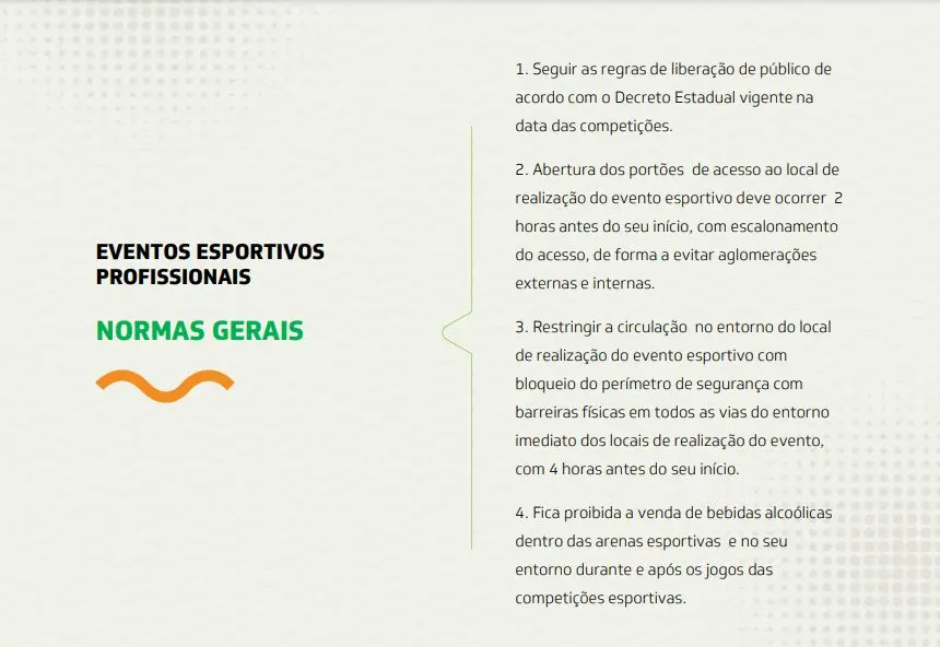 No documento, ao qual a Coluna teve acesso com exclusividade, é destacado no item 4 das normas gerais que "fica proibida a venda de bebidas alcoólicas dentro das arenas esportivas e no seu entorno durante e após os jogos das competições esportivas".