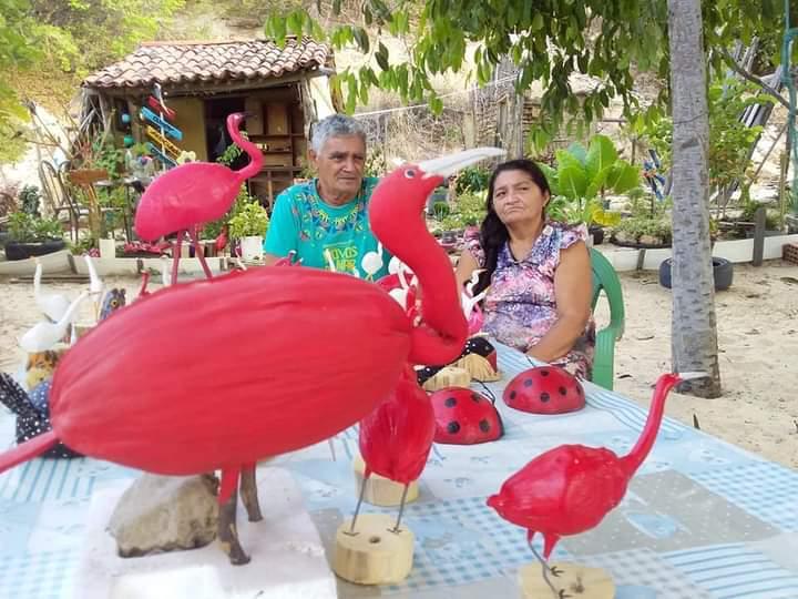 Trocou as areias coloridas pela madeira e outros materiais recicláveis com os quais faz pássaros e peixes. “Muita coisa aprendi com ele”, diz, referindo-se ao marido. Neste ano, mais uma vez eles se preparam para participar do Povos do Mar, que acontece de 20 a 24 de novembro no Sesc Iparana Hotel Ecológico.