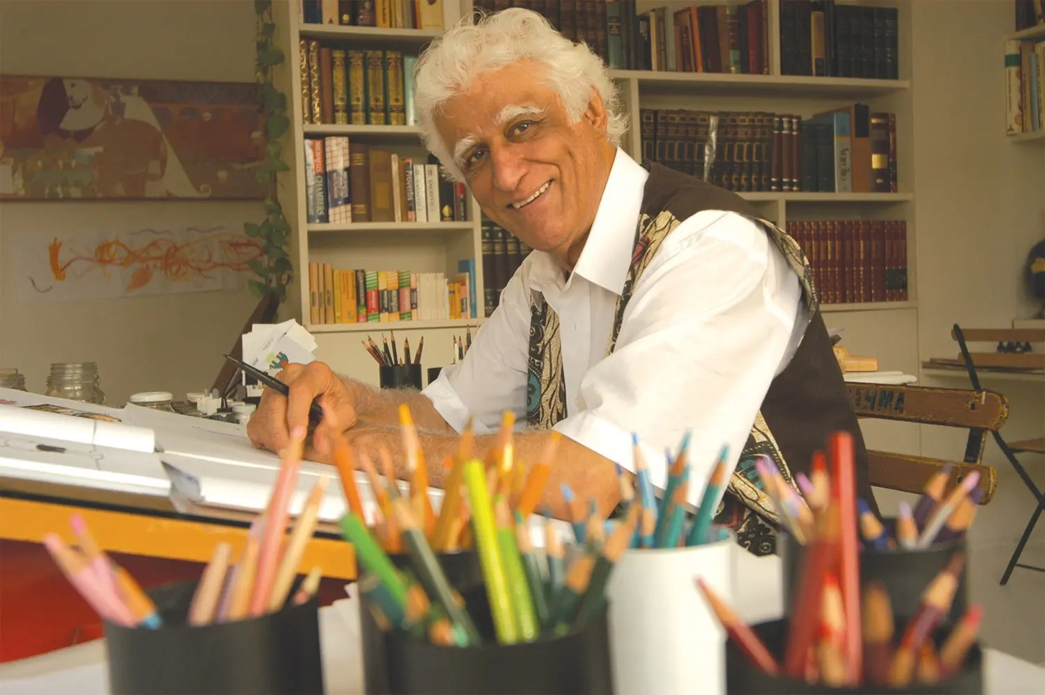 É que as mãos, desencontradas da caneta, delineiam suas palavras no ar. Os gestos exagerados que desenvolve enquanto fala precedem a obsessão para realizar o sonho de desenhar. E assim Ziraldo vai ilustrando, traço-a-traço, seus palpites sobre mundo, política, educação, vida. O desenho parece ser a linha que controla sua prolixidade e o escoamento do sincretismo que o envolve.
