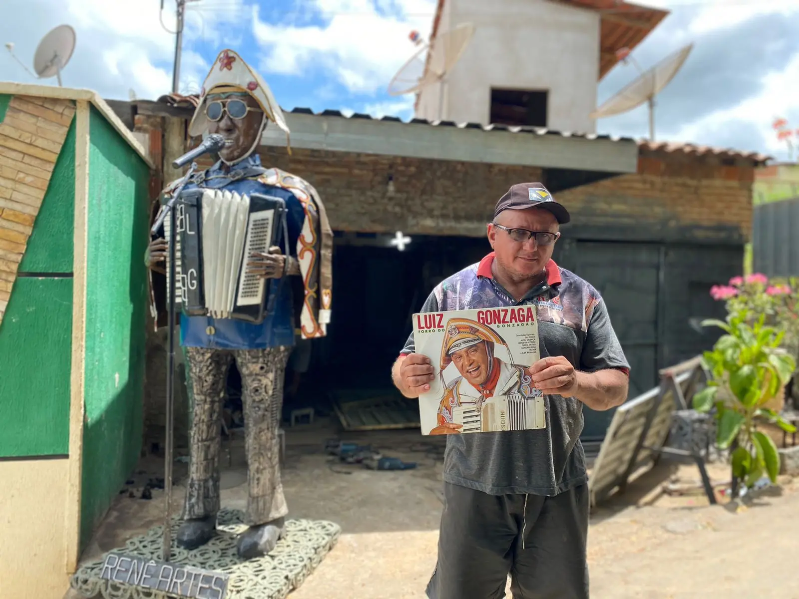 A obra mais simbólica que Renê tem hoje no ateliê é um Luiz Gonzaga de três metros de altura que ele esculpiu, uma homenagem pelo gosto que herdou do pai. “Sempre fui fã dele, desde criança, por influência do meu pai. Luiz Gonzaga representou o Nordeste para o mundo”, ele diz.