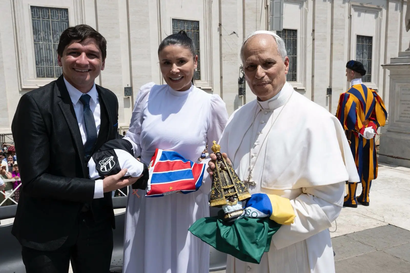 Recém-casados, eles foram até o Vaticano, em uma audiência geral para receber a bênção do pontíficie. E mais, após o momento religioso, eles presentearam o Papa LeãoXIV com uma imagem de Nossa Senhora Aparecida, padroeira do Brasil, junto com a bandeira brasileira, e as camisas dos clubes cearenses para que torcem.
