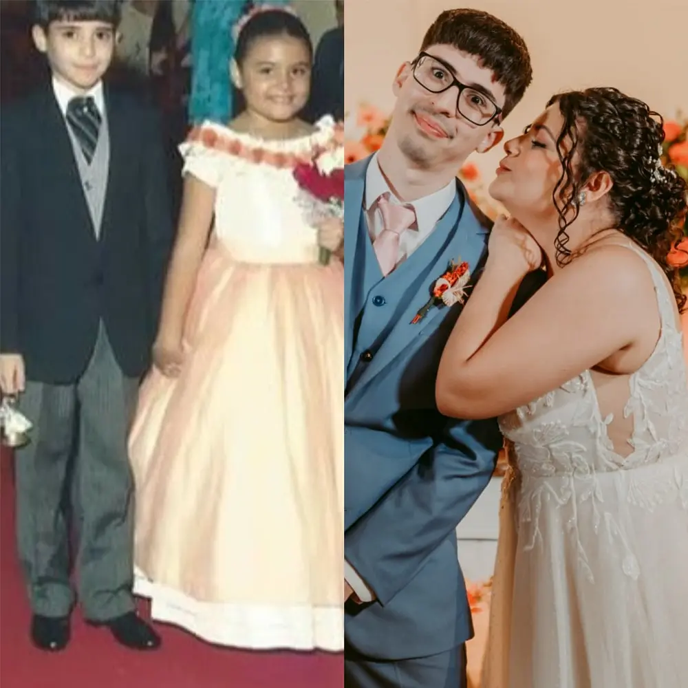 Dezoito anos após serem daminha e pajem, casal volta a subir ao altar, desta vez como noivos