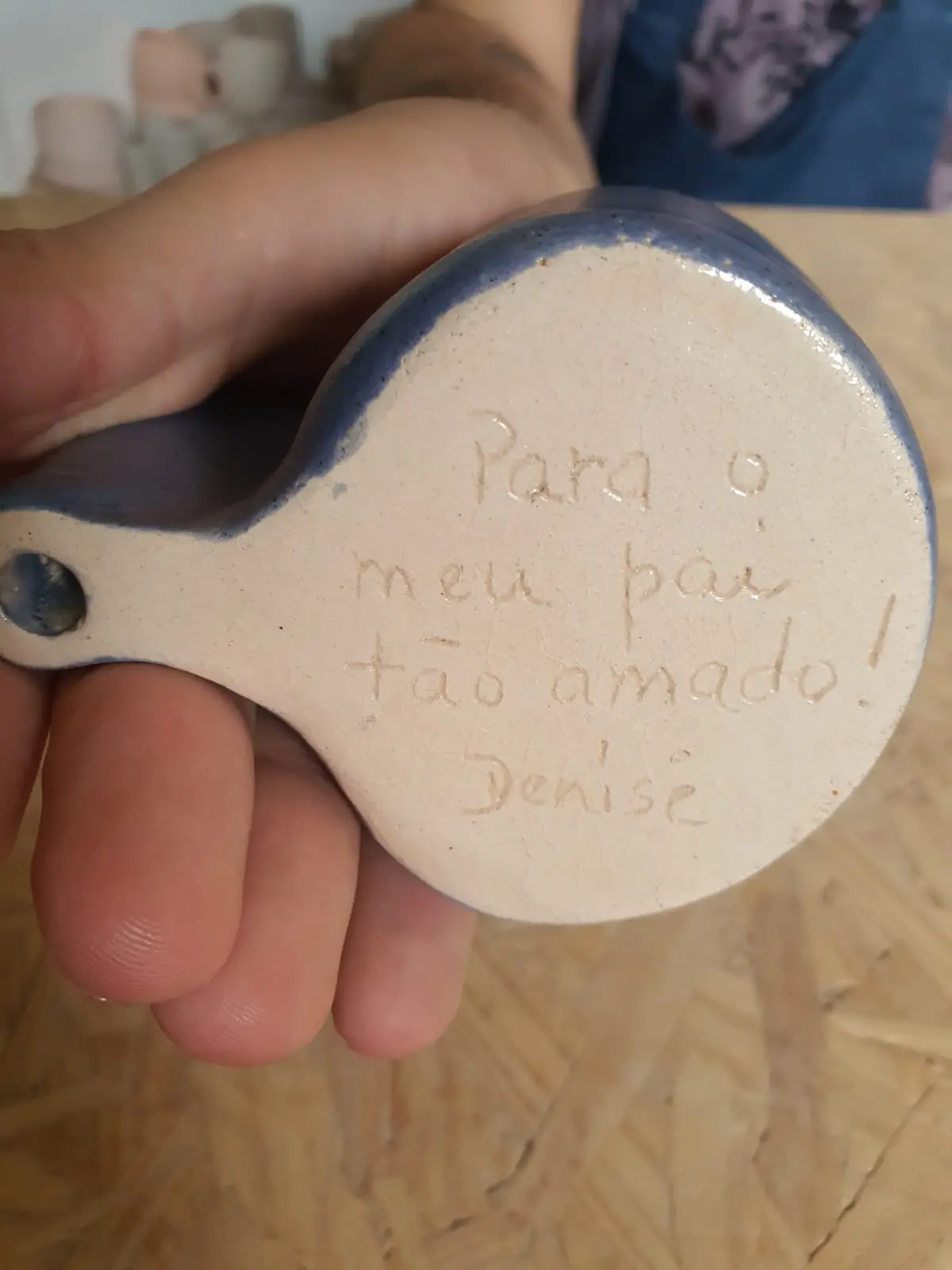 Mas Denise a contornou com aquilo que tem de mais precioso: o gosto por criar objetos com as mãos, dar existência carinhosa a seres inanimados. É ceramista. E assim gestou a Xícara Fish, pensada exclusivamente para que o pai não entornasse café nem precisasse beber de canudinho – uma vez os dedos não sustentarem canecas com alça tradicional.