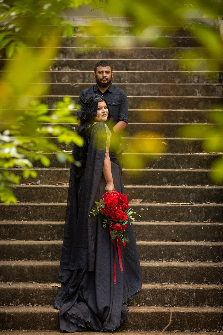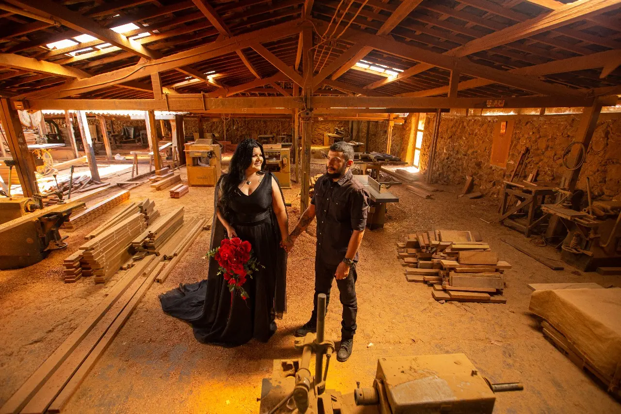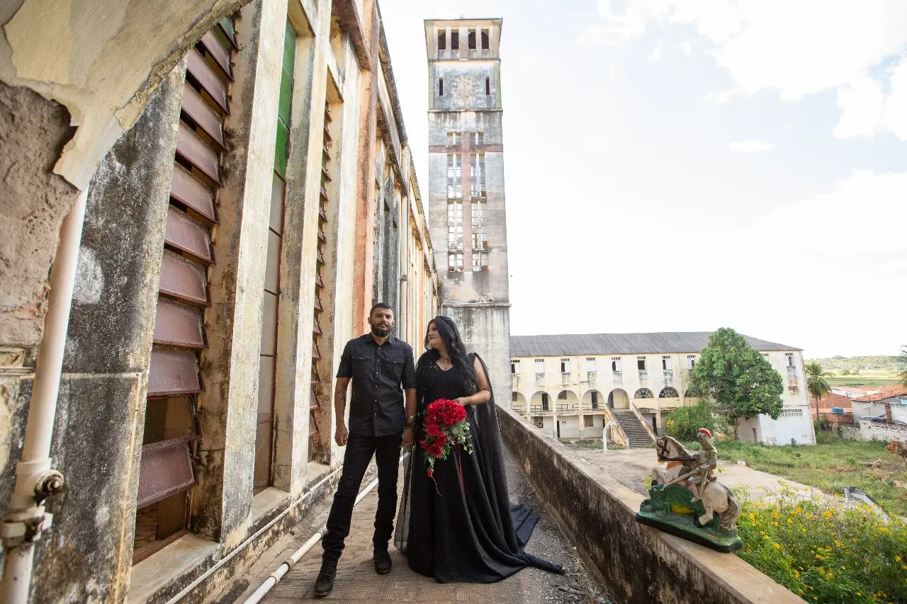 O casal que misturou vestes pretas, um lugar histórico do Cariri e muita autenticidade para imprimir o próprio jeito de enxergar o amor