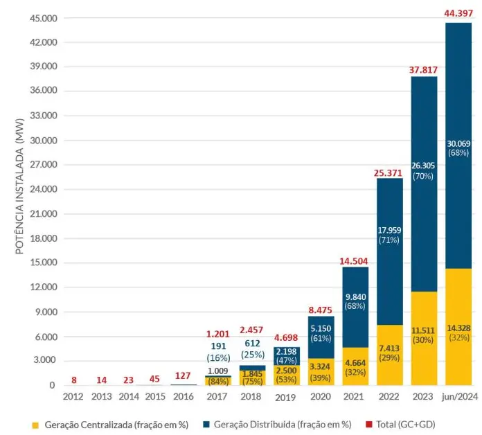 Aqui na Terra, principalmente no Brasil, a instalação de painéis fotovoltaicos vem crescendo cada vez mais. Em 2012, quando a fonte energética estava iniciando, a geração de energia elétrica solar representava apenas 8 MW (8 milhões de Watts) de potência instalada. Hoje, em 2024, a potência cresceu exponencialmente para 44,4 GM (44,4 bilhões de Watts), representando 19% da Matriz Elétrica Brasileira, dados da Associação Brasileira de Energia Solar Fotovoltaica (ABSOLAR, 2024).