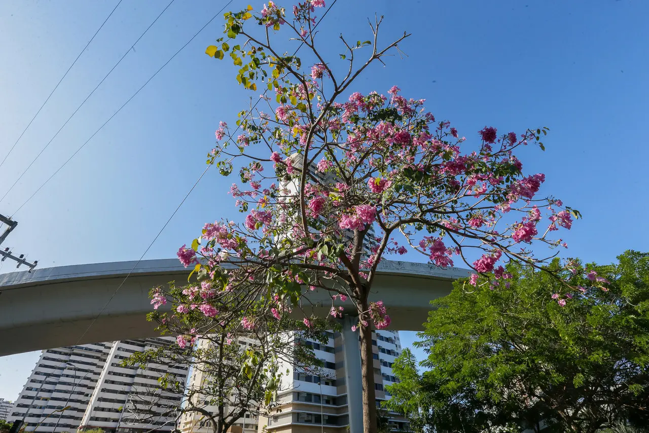 É possível notar os efeitos da primavera muito discretos em nosso Estado. Ali na Av. Pontes Vieira, algumas árvores demarcam bem a chegada da primavera com lindas flores rosas