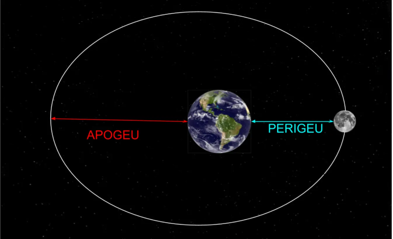 Como sabemos deste Kepler (1571-1630), as órbitas dos astros do sistema solar são elípticas, e com a Lua não é diferente. Em seu movimento de revolução ao redor da Terra, o perigeu (Do grego, PERI=perto e GÊ=Terra) é quando o nosso satélite se encontra mais próximo da Terra. Do contrário, o apogeu é quando a Lua se encontra em seu ponto mais distante da Terra.