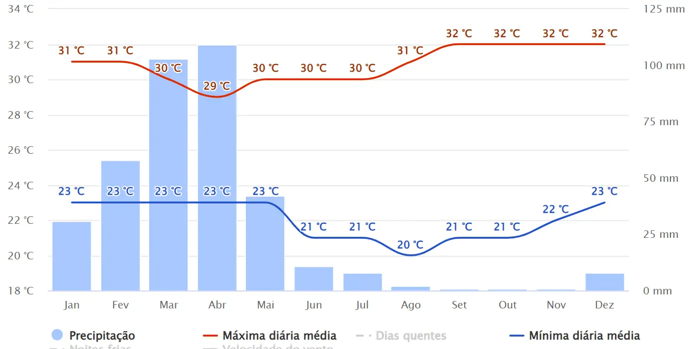 Mesmo assim, é inverno e é possível verificar uma queda de 2ºC na temperatura mínima para 21ºC. Você pode perceber pela manhã. Contudo, as tardes continuam quentes com temperatura média de 30ºC.