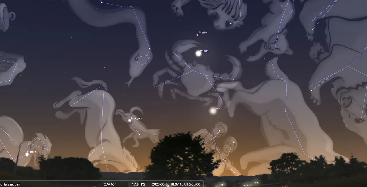 Para complementar, as noites estão contempladas pelo brilho esplendoroso de Vênus em conjunção com a Lua e Marte por volta das 18h. Isso significa que os três astros poderão ser vistos perto um do outro sem uso de telescópio. Fica a dica de observação hoje à noite.