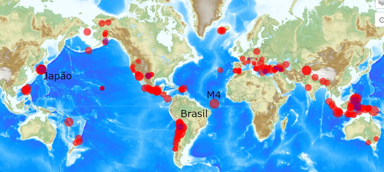 A Terra girando funciona como uma roleta e no caso do último ocorrido a região atingida pelo Sol foi no oceano pacífico que banha o país nipônico. Mas não podemos subestimar os poderes da natureza. No momento que escrevo este texto foi registrado um terremoto de magnitude 4 na falha entre a América e o continente africano, conforme se pode ver na imagem do CSEM-EMSC.