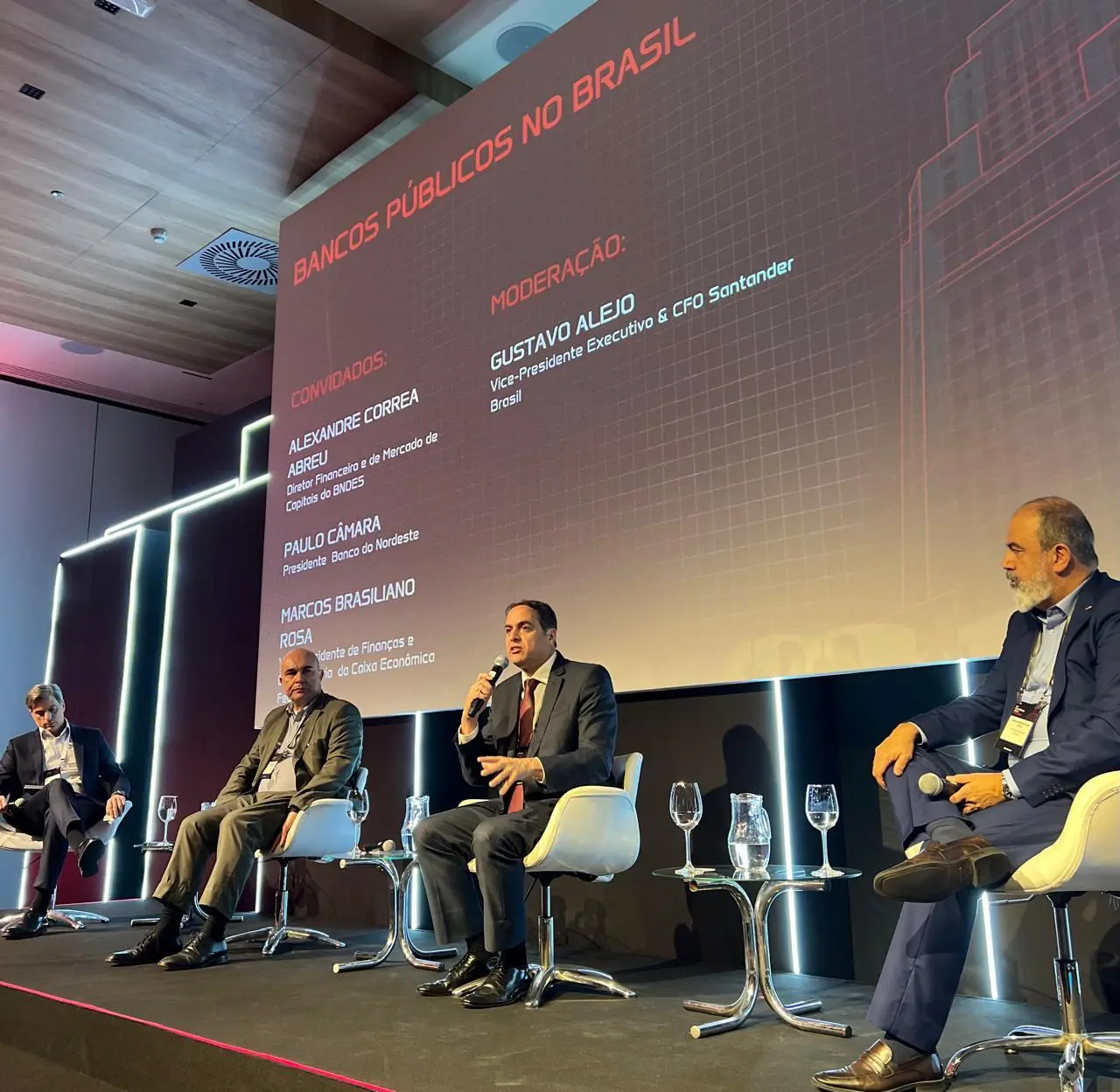 Participaram também do painel Alexandre Correa Abreu, diretor Financeiro e de Mercado de Capitais do BNDES, e Marco Brasiliano Rosa, vice-presidente de Finanças e Controladoria da Caixa Econômica Federal, sob a moderação de Gustavo Alejo, vice-Presidente Executivo e CFO do Santander Brasil.