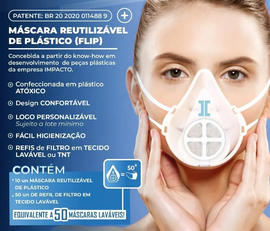 É uma máscara rígida, reutilizável, feita de plástico transparente e reciclável, atóxico, com refis de filtro em tecido lavável ou TNT (tecido não tecido).