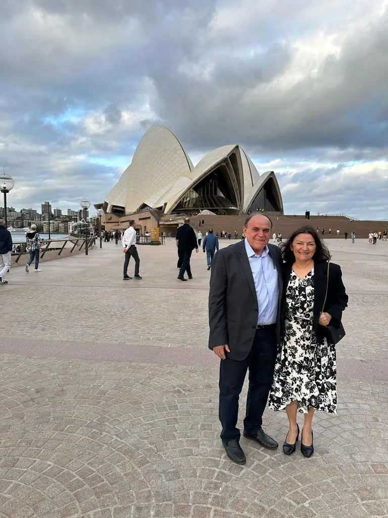 Ele transmitiu ontem, quarta-feira, para esta coluna uma foto que mostra o casal diante da Sidney Opera House, um dos mais belos monumentos da arquitetura mundial.