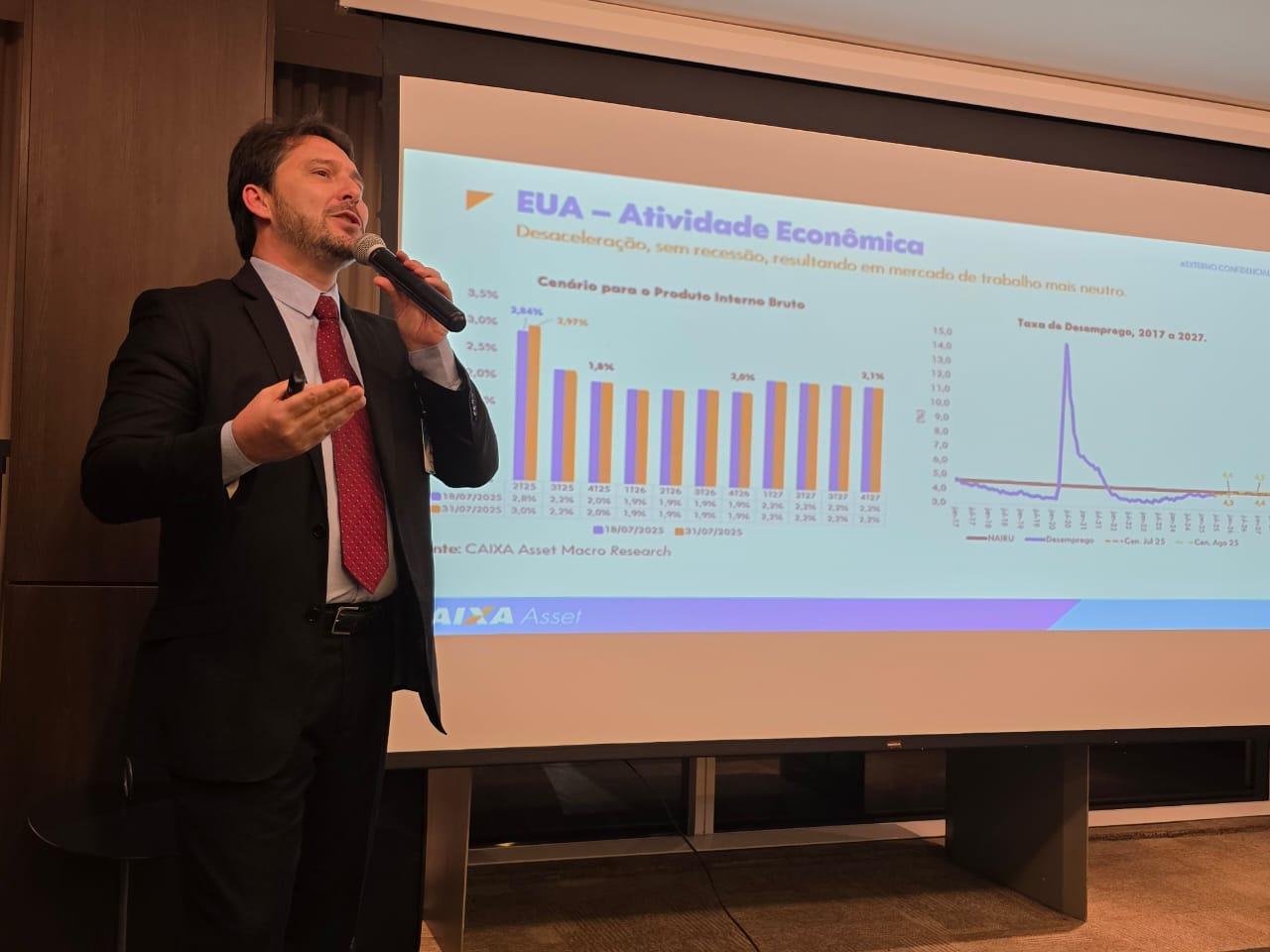 Quanto à economia brasileira, o economista-chefe da Caixa Asset – empresa que lidera os novos negócios do banco – reafirmou que a meta fiscal do governo será alcançada, mas frisou que os anos de 2026 e 2027 serão difíceis. Mesmo assim, ele projeta crescimento do PIB em mais de 2% neste ano, de 1,8% em 2026 e de 2% em 2027.