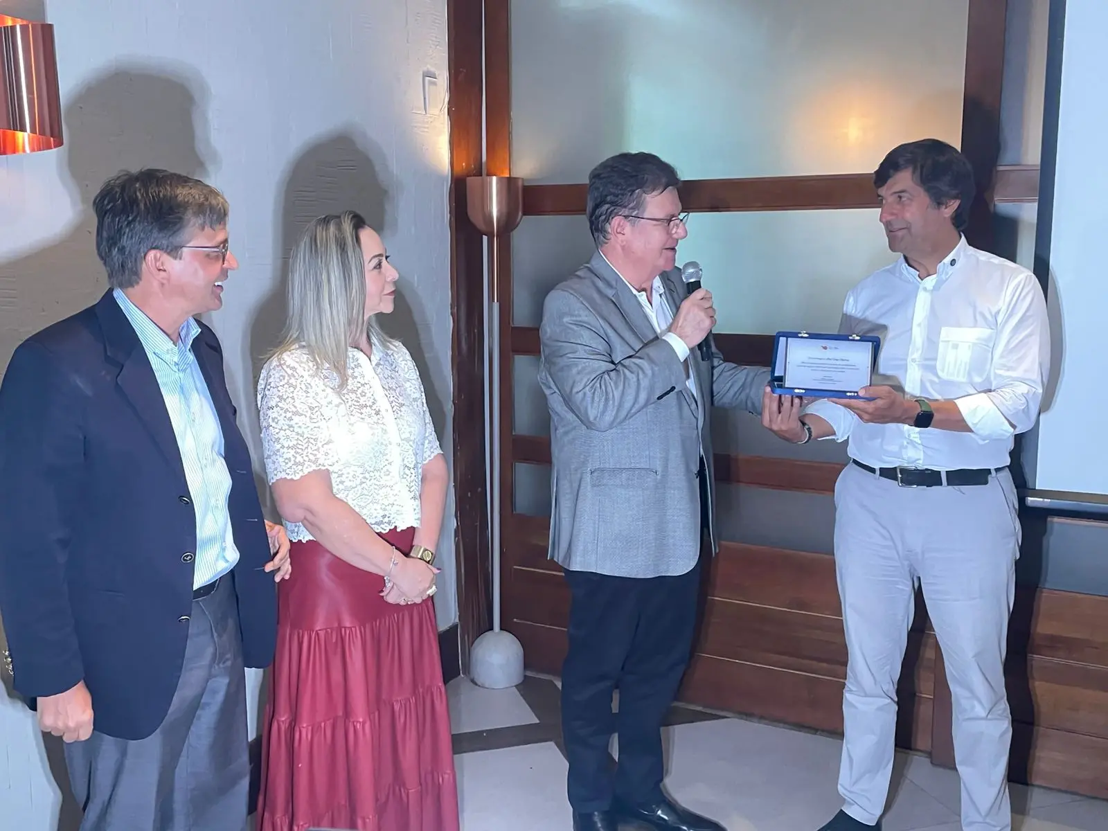 No final do evento, Carlos Maia – em nome da Termaco e da APSDV Advogados e ao lado de Patrícia Campos e de Rômulo Soares, um apaixonado militante da economia marinha – prestou homenagem ao professor Veiga, entregando-lhe uma placa de prata.