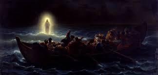 Ao cair da tarde, os discípulos desceram ao mar. Entraram na barca e foram em direção a Cafarnaum, do outro lado do mar. Já estava escuro, e Jesus ainda não tinha vindo ao encontro deles. Soprava um vento forte e o mar estava agitado. Os discípulos tinham remado mais ou menos cinco quilômetros, quando enxergaram Jesus, andando sobre as águas e aproximando-se da barca. E ficaram com medo. Mas Jesus disse: 'Sou eu. Não tenhais medo'. Quiseram, então, recolher Jesus na barca, mas imediatamente a barca chegou à margem para onde estavam indo.