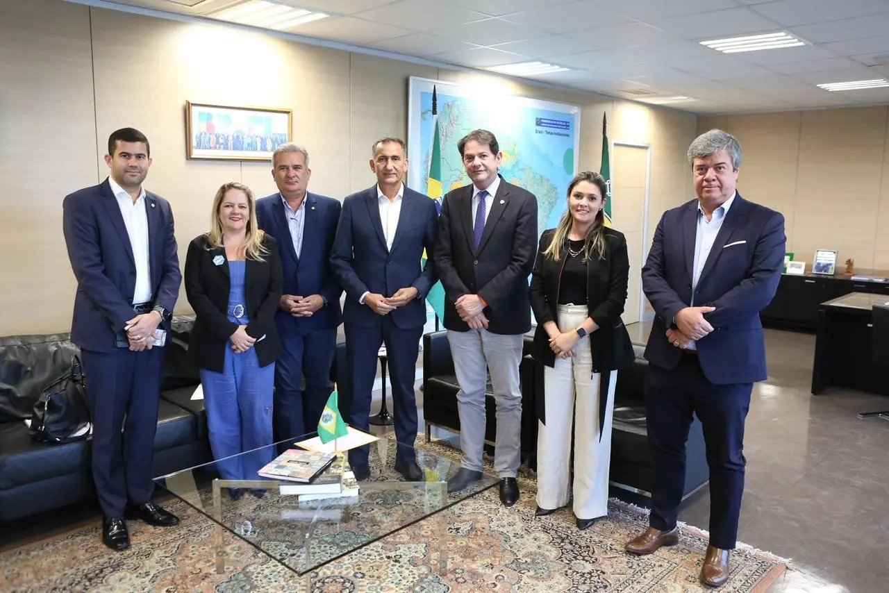 O presidente da Faec, Amílcar Silveira – acompanhado do senador Cid Gomes, do empresário Luiz Roberto Barcelos, presidente da Rede Nacional de Agricultura Irrigada (Renai) e sócio e diretor da Agrícola Famosa, que produz melão em Icapuí, e do secretário Executivo da SDE, agrônomo Sílvio Carlos Ribeiro – foi recebido ontem em audiência pelo ministro Waldez Goes, com quem tratou do assunto.