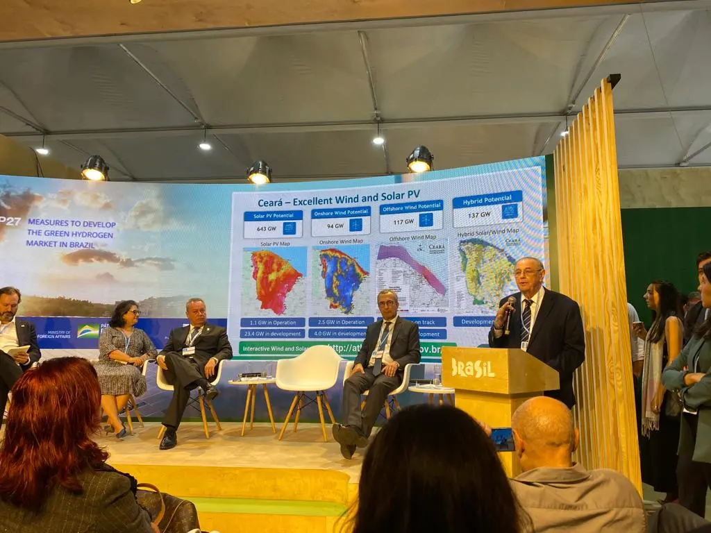 No estande do Brasil na Cop27, em Sharm el-Sheikh, no Egito, o engenheiro Jurandir Picanço, consultor em energia da Federação das INdústriasdo Ceará (Fiec), expôs nesta quarta-feira o que o governo, a iniciativa privada e a academia do Ceará estão fazendo, neste momento, para a implantação do Hub do Hidrogênio Verde no Complexo Industrial e Portuário do Pecém.