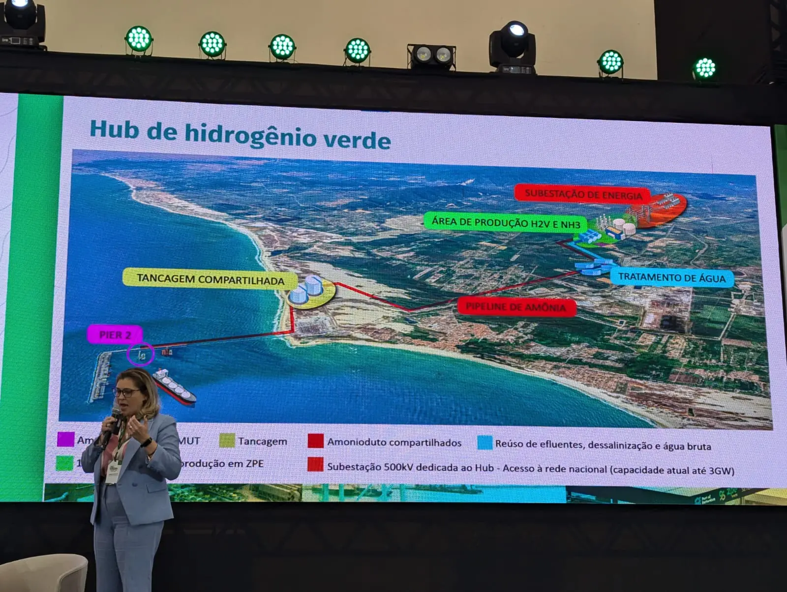 Picanço começou anunciando que, nos próximos cinco anos, serão feitos investimentos de R$ 4,2 bilhões em projetos públicos e privados de infraestrutura para apoiar as empresas que produzirão hidrogênio verde no Complexo do Pecém. E os detalhou: na ampliação do Porto do Pecém, serão investidos R$ 700 milhões; em infraestrutura hídrica, R$ 150 milhões; em água de reuso, R$ 300 milhões; em Linhas de Transmissão de energia elétrica, R$ 2,27 bilhões; em dutos e tancagem de amônia, R$ 780 milhões.