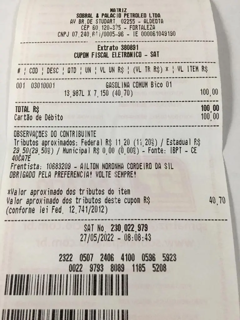 Resumo: dos R$ 100 pagos pelos 13,98 litros de gasolina, R$ 40,70 foram relativos a impostos.