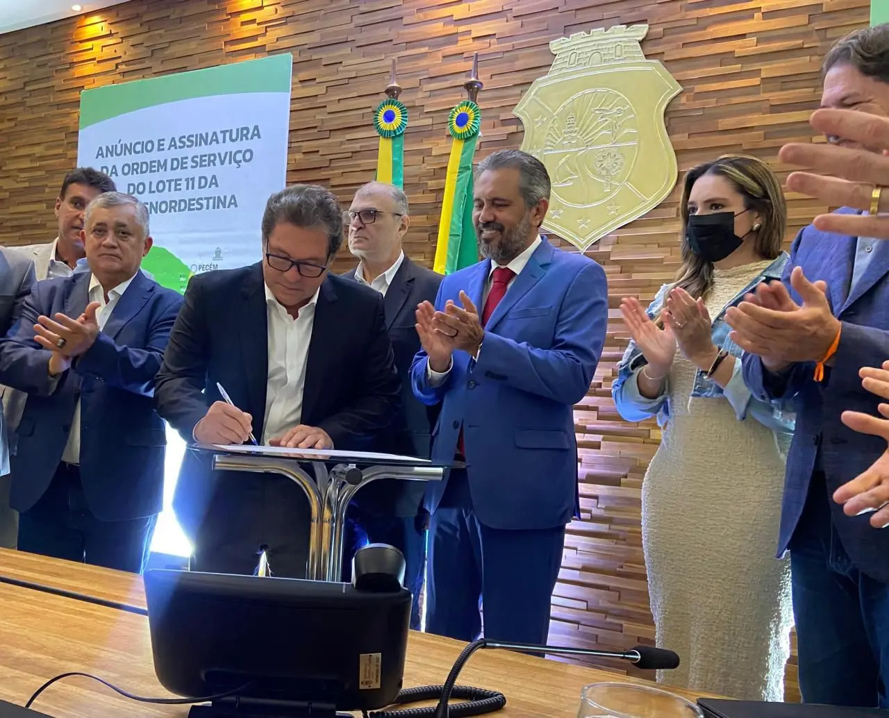 Em solenidade realizada na manhã desta segunda-feira, 27, no Palácio da Abolição, o governador Elmano de Freitas, o presidente da Transnordestina Logística (TLSA), Tufi Daher Filho, e o diretor da Marquise Infraestrutura, Renan Carvalho, oficializaram a assinatura da ordem de serviço para a construção do trecho 11 da Ferrovia Transnordestina.