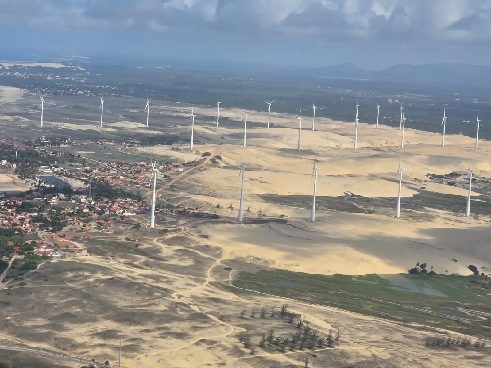 Agora, uma constatação positiva e outra negativa. A primeira refere-se aos parques eólicos que existem em abundância ao longo de todo o Litoral Norte e Oeste. Eles enfeitam a paisagem de toda a área, geram energia eólica que é injetada na rede do Sistema Elétrico Nacional, e para isto foram construídas subestações e redes de alta tensão que são vistas do alto. A maioria dos parques eólicos opera normalmente e podem ser vistas as gigantescas hélices dos seus aerogeradores girando pela força dos ventos. Esses parques também geram renda para os donos dos terrenos nos quais estão implantados.