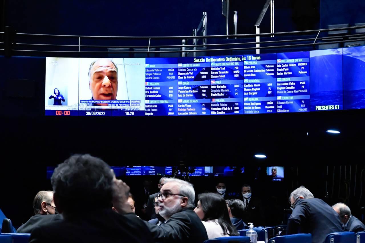 O Plenário do Senado aprovou nesta quinta-feira (30) a proposta de emenda à Constituição (PEC) que institui estado de emergência até o final do ano para ampliar o pagamento de benefícios sociais (PEC 1/2022). A proposta foi votada em dois turnos a agora segue para a Câmara dos Deputados.