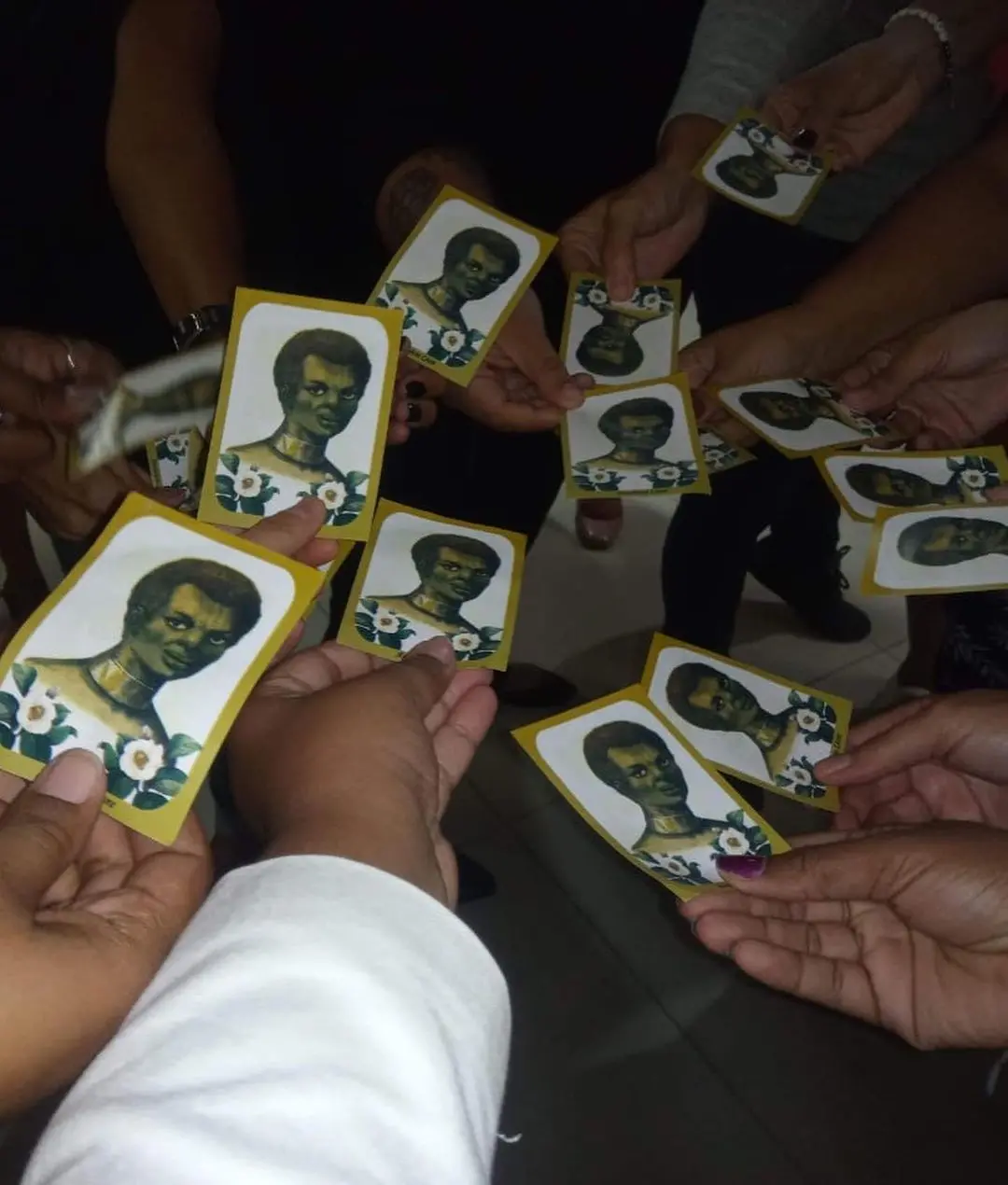 Santinho é aquela peça gráfica que carrega uma oração ou ilustra a cara eufórica de algum candidato político. Quando criança, a gente empilhava santinhos como se fossem cédulas. Em brincadeiras de aposta, aquela era a nossa moeda. Nunca olhei pro santinho como um repositório de fé ou dispositivo de comoção. O sentimento mudou. Hoje, guardo um santinho na carteira. Ele projeta o rosto de uma mulher negra enfeitada de bromélias. Anastácia. Nos livros de história da minha infância, eu a vi amordaçada. No reencontro promovido pela arte, em minha fase adulta, me deparo com ela coroada em um altar de flores. Sua existência me abraça com fervor.