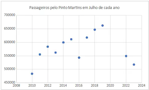 A movimentação de passageiros no Aeroporto Internacional de Fortaleza em julho de 2023 foi a pior desde 2010. Nesta alta estação, passaram pelo terminal 517,5 mil pessoas, enquanto em igual período de 2010 foram 483 mil. Os dados são da Agência Nacional de Aviação Civil (Anac).