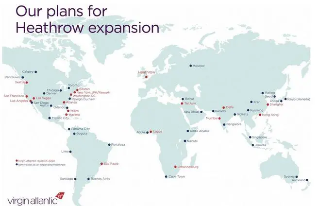 Voltando para 2019, a empresa aérea Virgin Atlantic apresentava um mapa com novos destinos para o caso de expansão do aeroporto de Heathrow: “New routes at an expanded Heathrow”. E Fortaleza estava lá como destino futuro.