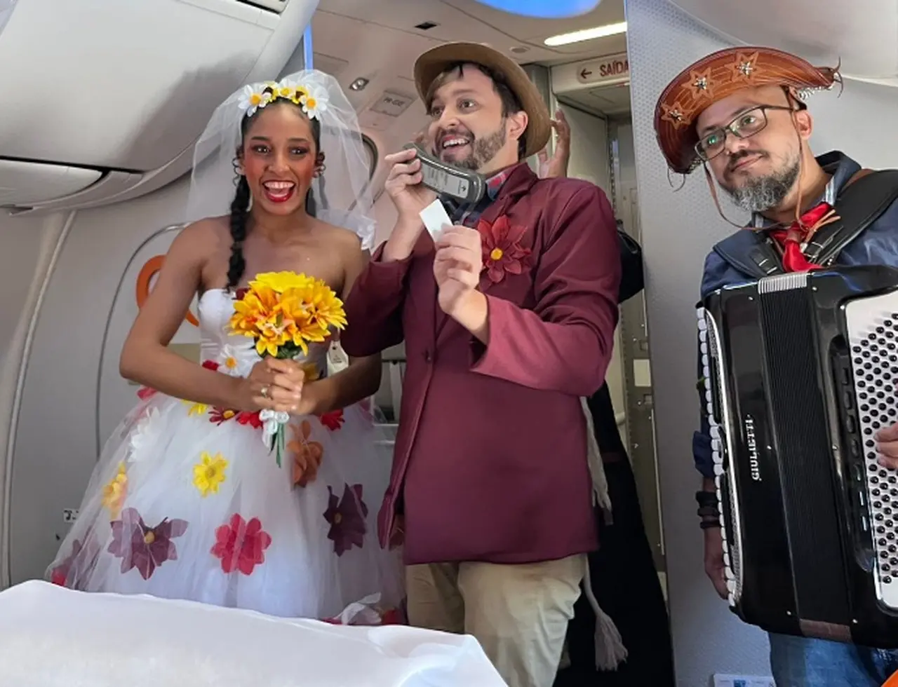 Felizmente, o tempo em rota era excelente e o voo não teve o aviso de atar cintos acionados após a decolagem em voo de cruzeiro. A encenação assim, ocorreu de forma completa, sem interrupções. Todos vibravam com a vontade de casar dos noivos, gargalhavam com as piadas do padre e cantavam seguindo o ritmo do sanfoneiro, algo certamente inovador na aviação comercial.